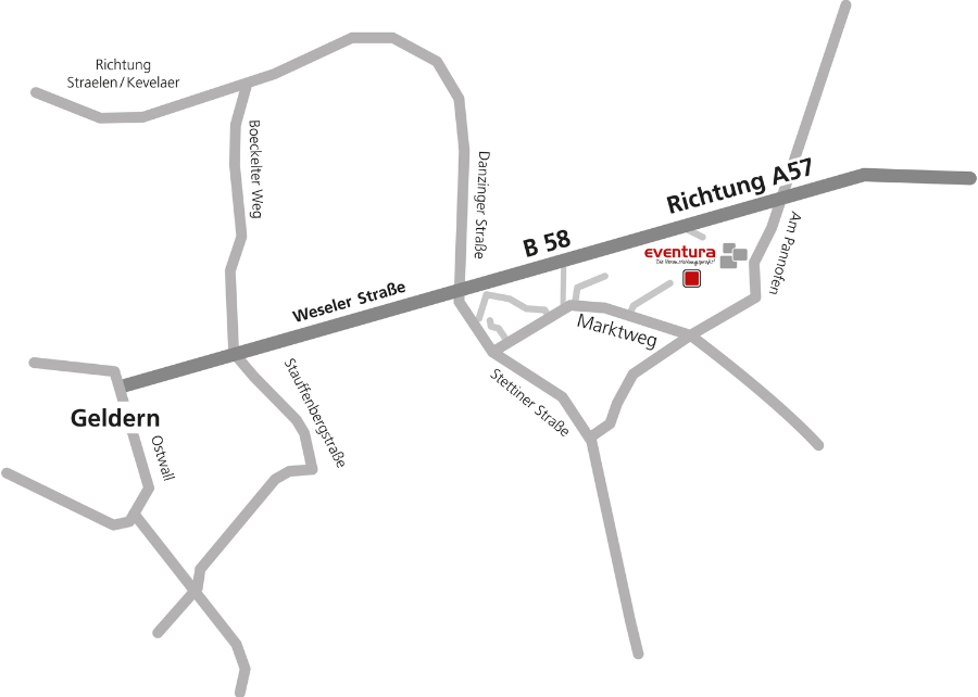 Aus Richtung Osten kommend nehmen Sie die Abfahrt Alpen (6) und biegen rechts ab auf die B58 in Richtung Geldern. Stadteinwärts biegen Sie an der Ampelkreuzung nach links auf die Stettiner Straße